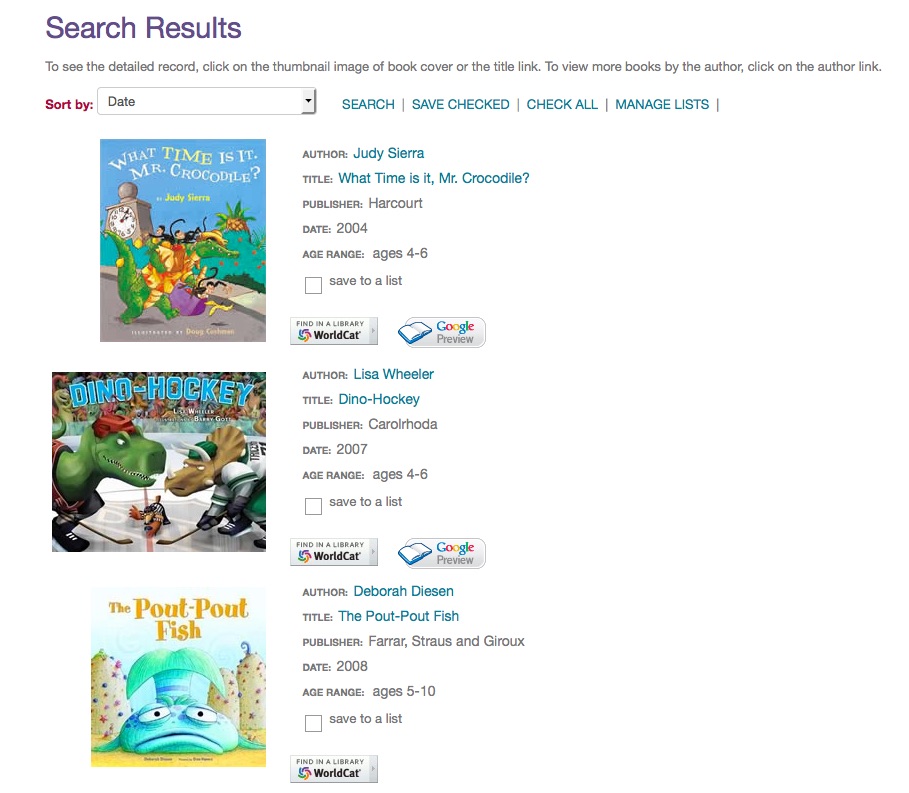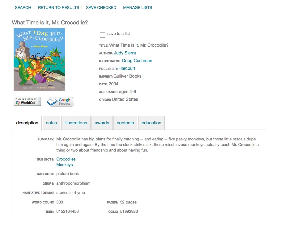 The DETAILED record of each book features six tabs as well as full bibliographic data. Some tabs may not contain any information. Like the RESULTS screen, the detailed record contains links to OCLC and Google Preview. You can also add the title to a list from either screen.